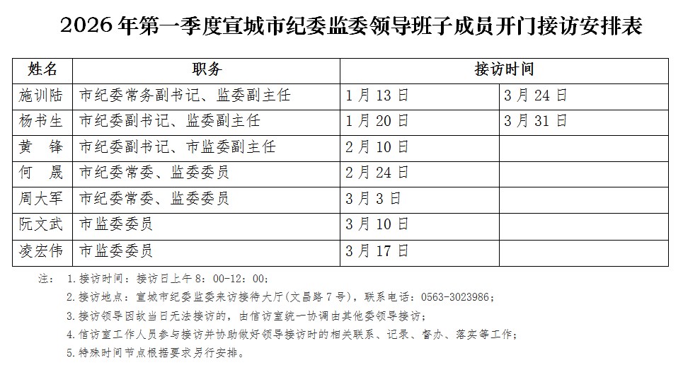 2026年第一季度宣城市纪委监委领导班子成员开门接访安排表
