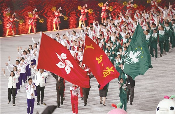 2025年11月9日,广东省体育代表团、香港特别行政区体育代表团和澳门特别行政区体育代表团在第十五届全国运动会开幕式上共同入场。新华社记者 赖向东 摄
