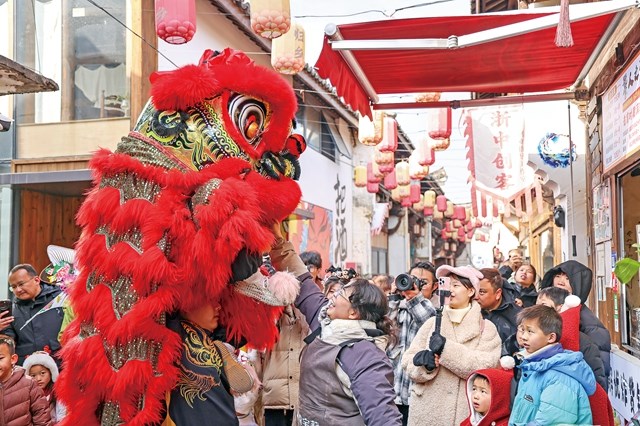 近年来,以文化旅游、数字消费和绿色消费等为代表的新型消费模式蓬勃兴起,既丰富了人民的美好生活,又激发了经济发展的消费新动能。图为元旦假期,游客在浙江省金华市金东区岭下镇坡阳古街观看舞狮表演。 图片来源:视觉中国