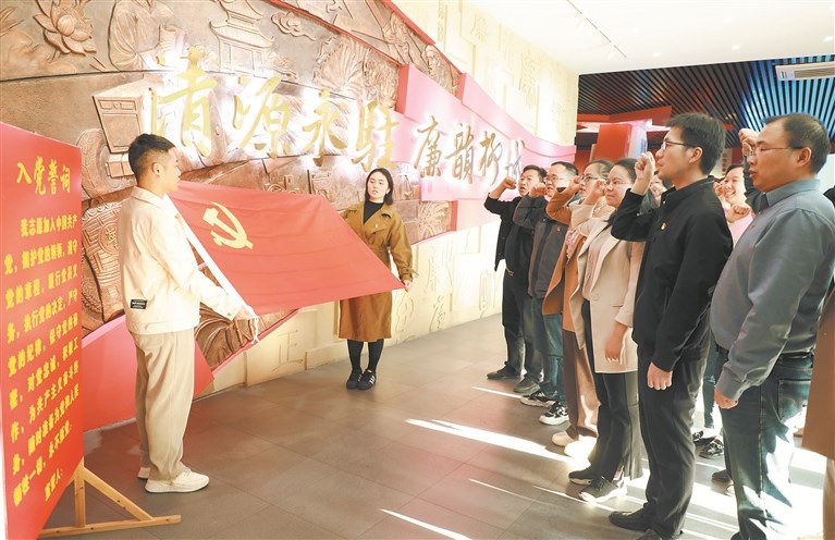 广西壮族自治区柳城县通过开展多种形式学习教育,推动党员、干部铸牢对党绝对忠诚政治品格。图为该县党员干部到廉政教育基地开展主题党日活动,重温入党誓词。陈婕 摄