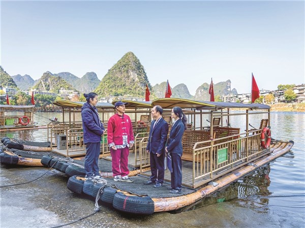 广西壮族自治区阳朔县纪委监委紧盯保护好漓江、保护好桂林山水这一“国之大者”,开展漓江流域水质提升专项监督,推动抓好漓江流域生态环境保护。图为近日,该县纪检监察干部在漓江景区观莲码头了解生态环境治理情况。 夏立慧 摄