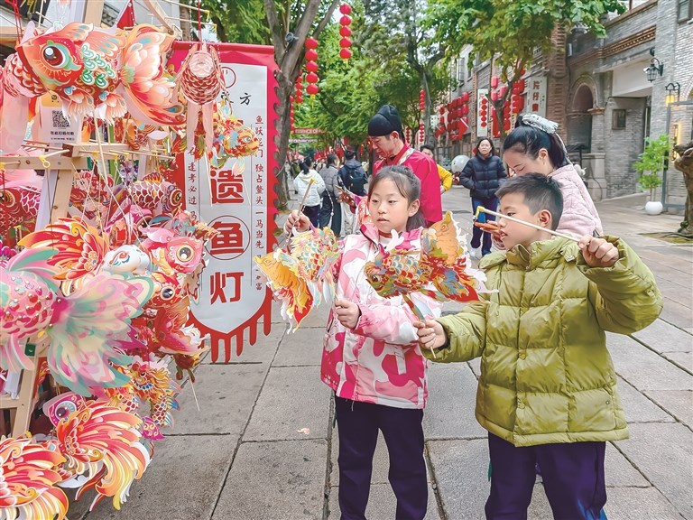 2月11日,福建省福州市台江区上下杭历史文化街区游人如织,游客在此赏街区美景、看非遗鱼灯、穿民俗服饰。图为游客在挑选非遗鱼灯。 图片来源:视觉中国