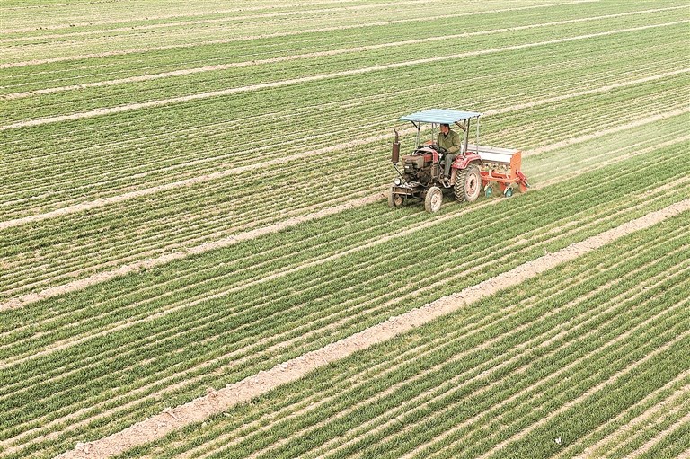 图为近日,在山东省聊城市茌平区韩屯镇韩屯新村,农民驾驶农机进行小麦施肥作业。