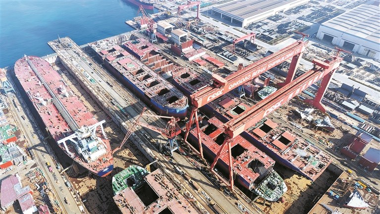 2月25日,山东青岛海西湾船舶与海洋工程产业基地生产工地一派繁忙。 新华社发(俞方平 摄)
