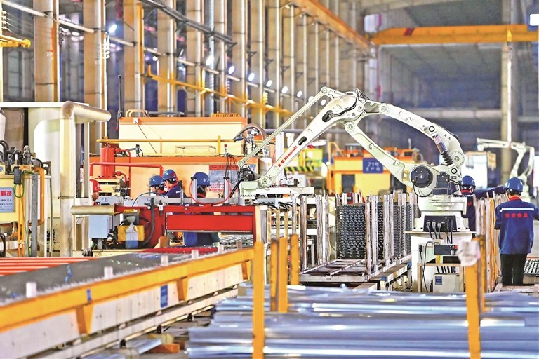 近年来,江西省抚州市大力帮扶当地企业进行数字化改造升级,围绕产业布局优化、产业结构调整、产线智能升级等进行强链、补链、延链。同时,帮助企业对接高等院校共同研发生产设备、优化生产流程,提升产业智能制造水平。图为该市临川区一家铝基新材料生产基地,工人在智能生产线加工铝材产品。图片来源:视觉中国