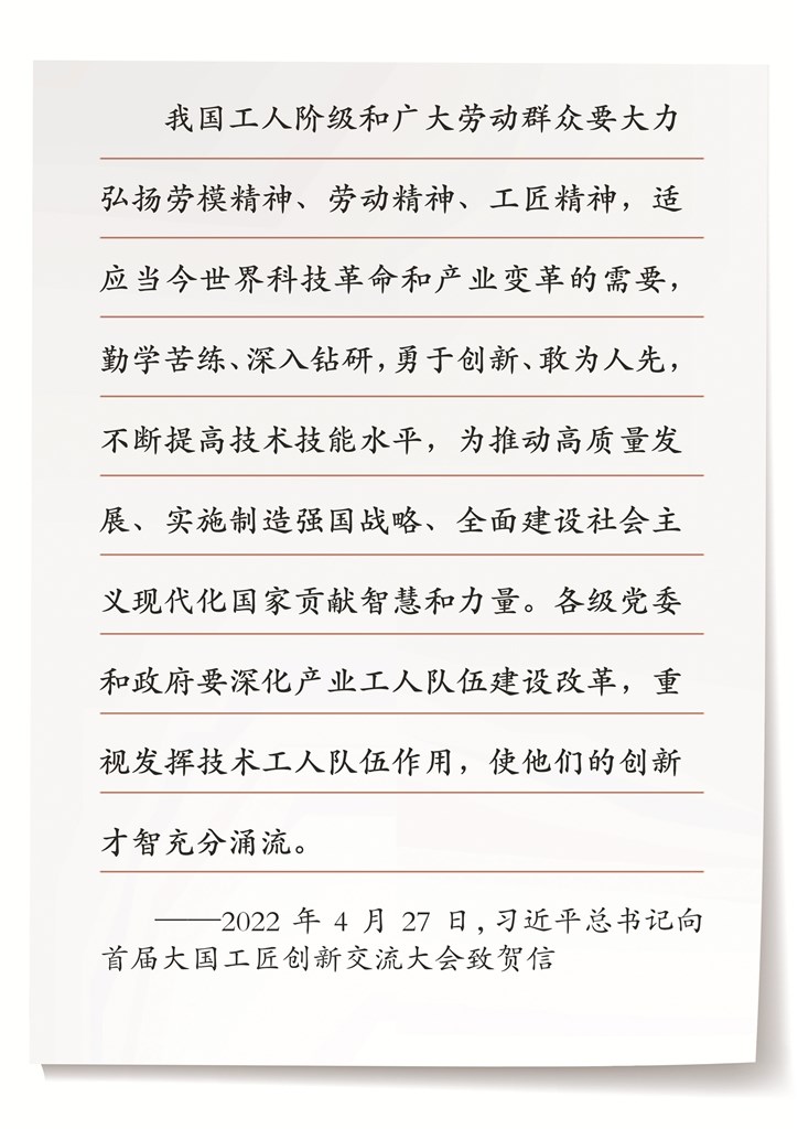 2022年4月,习近平总书记在致首届大国工匠创新交流大会的贺信中强调:“我国工人阶级和广大劳动群众要大力弘扬劳模精神、劳动精神、工匠精神,适应当今世界科技革命和产业变革的需要,勤学苦练、深入钻研,勇于创新、敢为人先,不断提高技术技能水平,为推动高质量发展、实施制造强国战略、全面建设社会主义现代化国家贡献智慧和力量。”