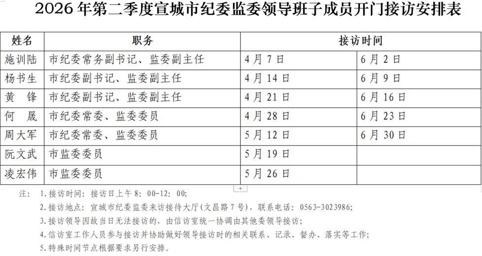 2026年第二季度宣城市纪委监委领导班子成员开门接访安排表