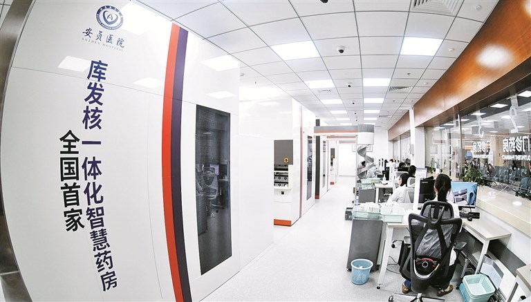图为北京安贞医院通州院区库发核一体化智慧药房。该院作为北京市政府指定的首家“机器人+医疗”应用示范单位,已有25款医疗机器人在临床试用,覆盖了门诊、药房、病房、手术室、导管室等多个区域。新华社记者 李欣 摄