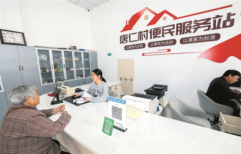 近年来,为优化基层政务服务效能,浙江省诸暨市同山镇以集成化、高效化、便民化服务纾企困、暖民心,优化营商环境、增进民生福祉。图为近日,同山镇唐仁村村民在村便民服务站办理业务。新华社记者 徐昱 摄