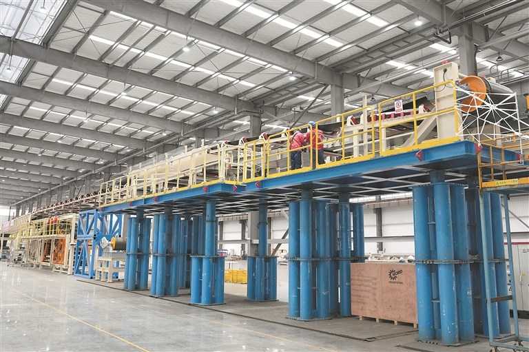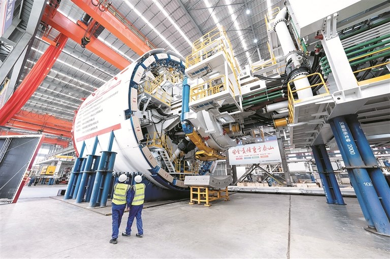 近日,国产14米级超大直径盾构机“奋楫号”在江苏南通顺利下线。图为中铁十四局监造人员对盾构机整机进行验收。 新华社发(林凤 摄)